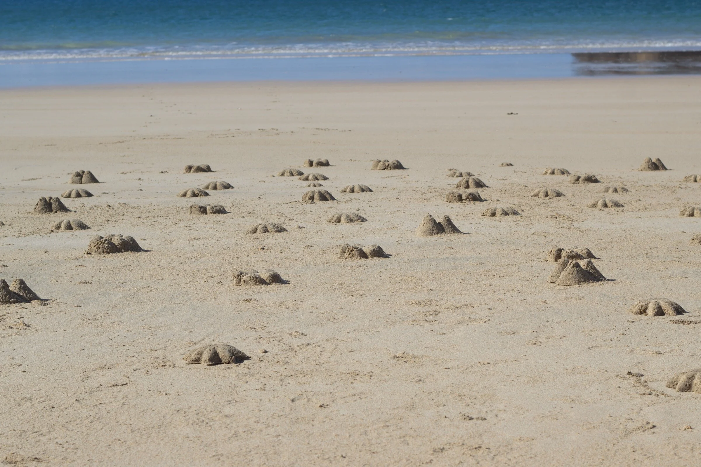 I create a number of temporary installations on the beach and use the existing molds from The Wonderment and Materiality Series. Because I am in strict lockdown in New Zealand I use the readily available material and locations at hand: sand and beaches.